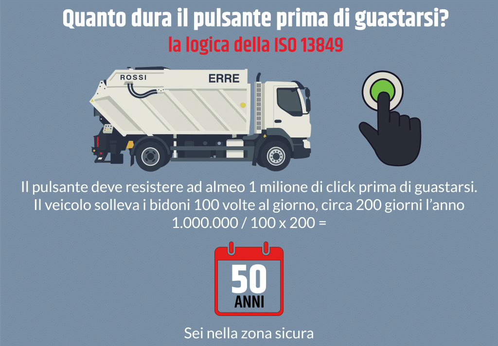 Per i comandi che azionano movimenti pericolosi come quelli di sistemi di compattazione, voltabidoni e movimentazione vasca, la normativa di riferimento si chiama ISO 13849. Questa norma si concentra sulla progettazione, l’implementazione e la validazione di tali sistemi, garantendo che siano in grado di ridurre i rischi associati a situazioni pericolose durante il funzionamento delle macchine.
